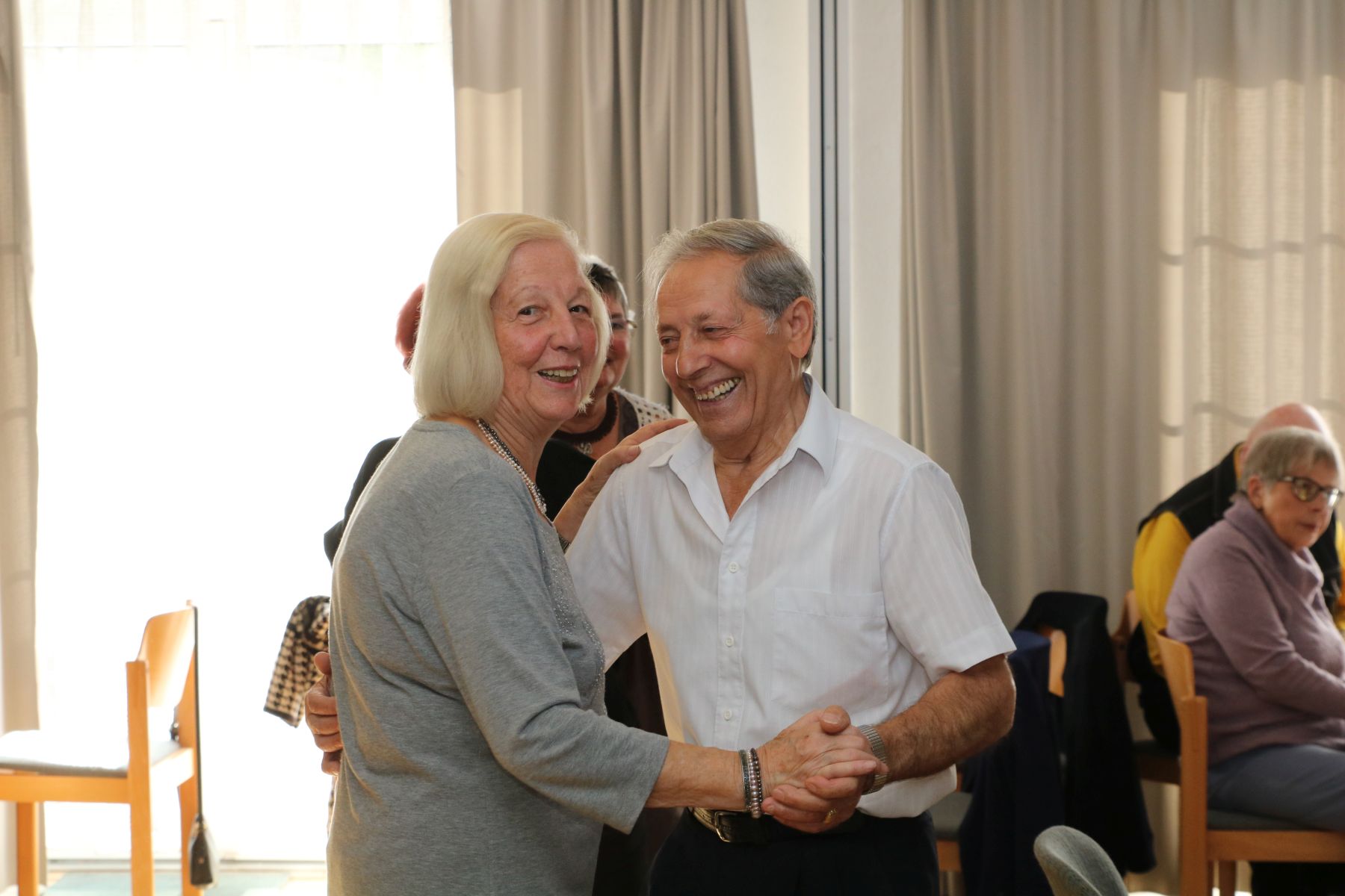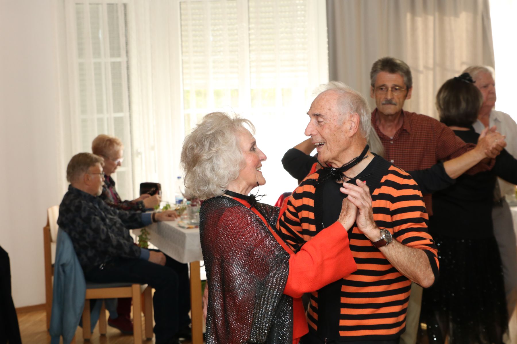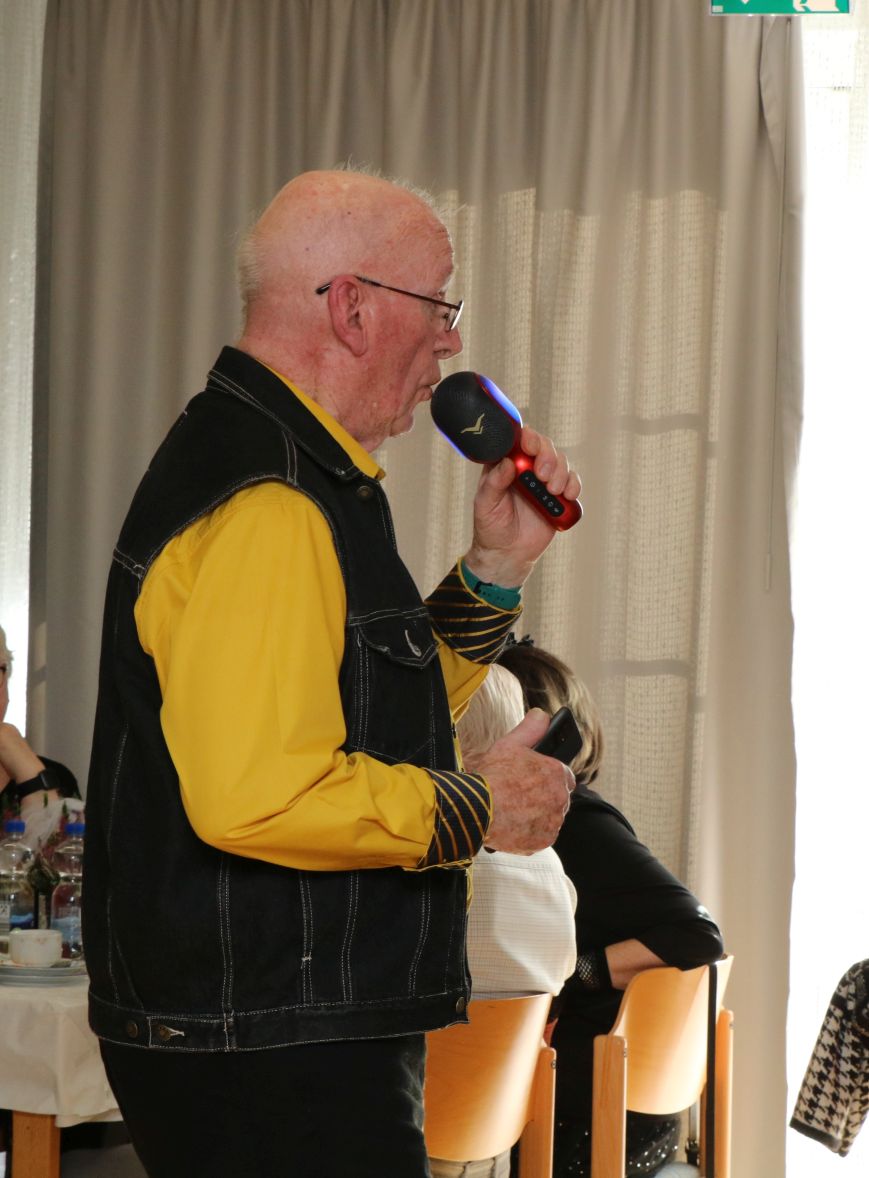 Ein paar liebe Gäste überraschten alle Tanzteebesucher und die Ehrenamtlichen mit mehreren Flaschen Sekt, um ihre Hochzeit zu feiern. Seiner Angebeteten sang der Gatte ein liebevolles Ständchen und alle prosteten ihnen einen Glückwunsch zu. Was für ein gelungener Nachmittag!