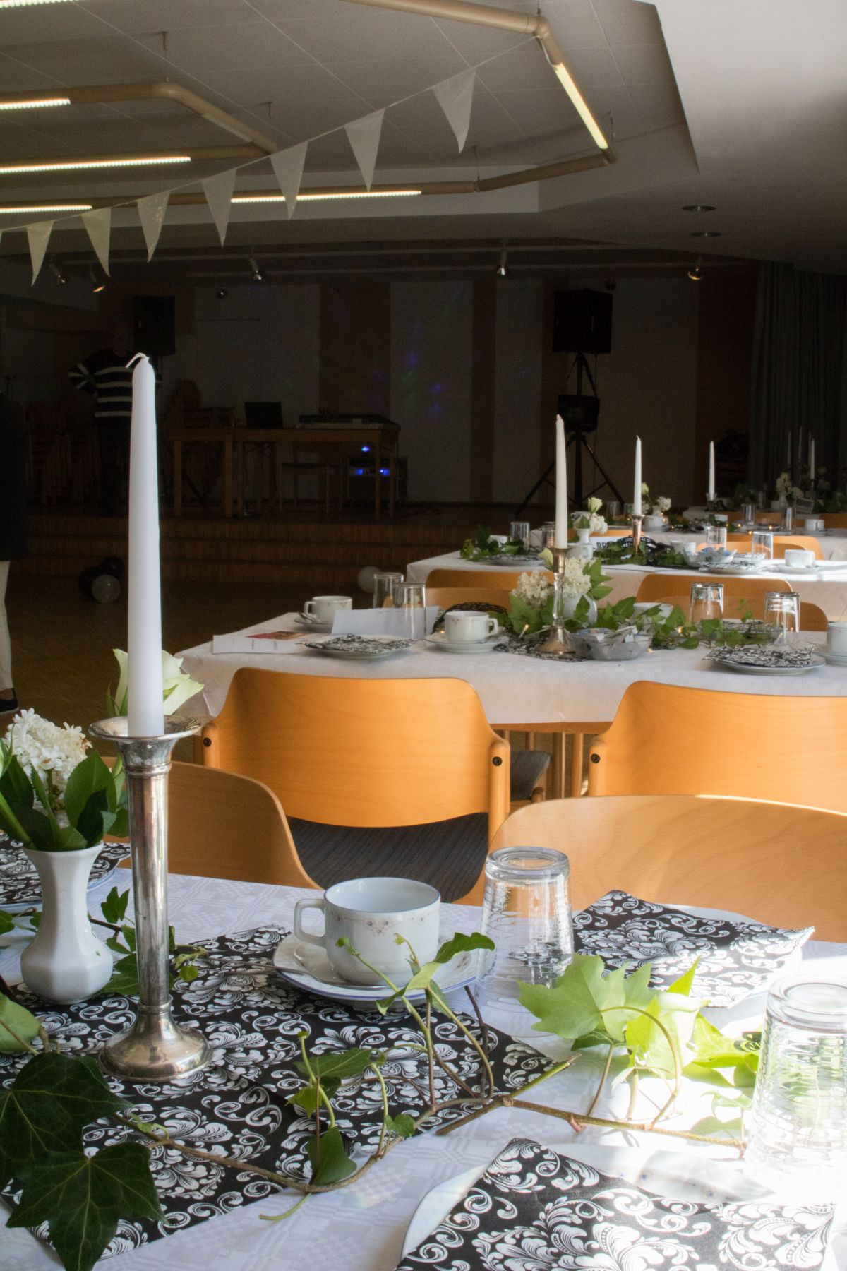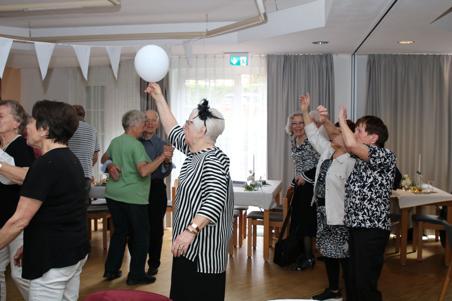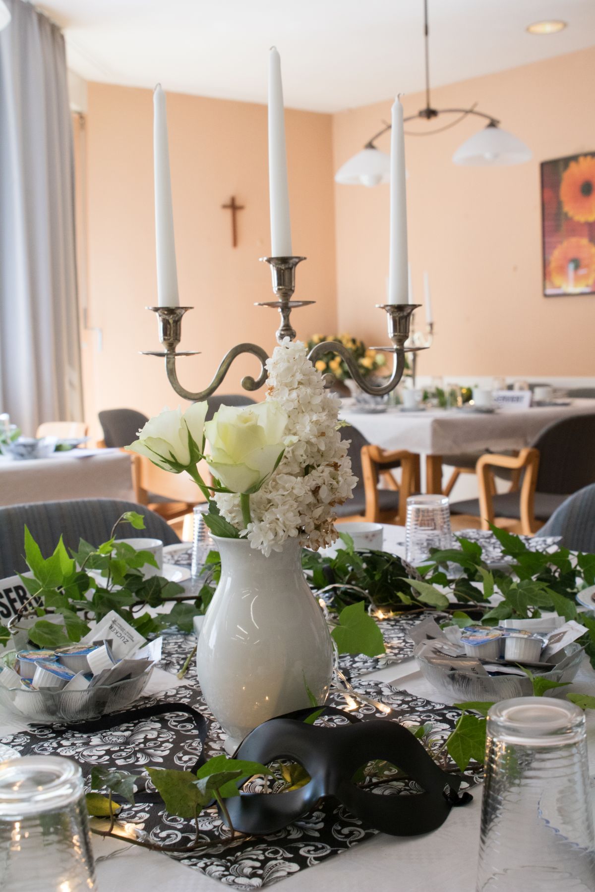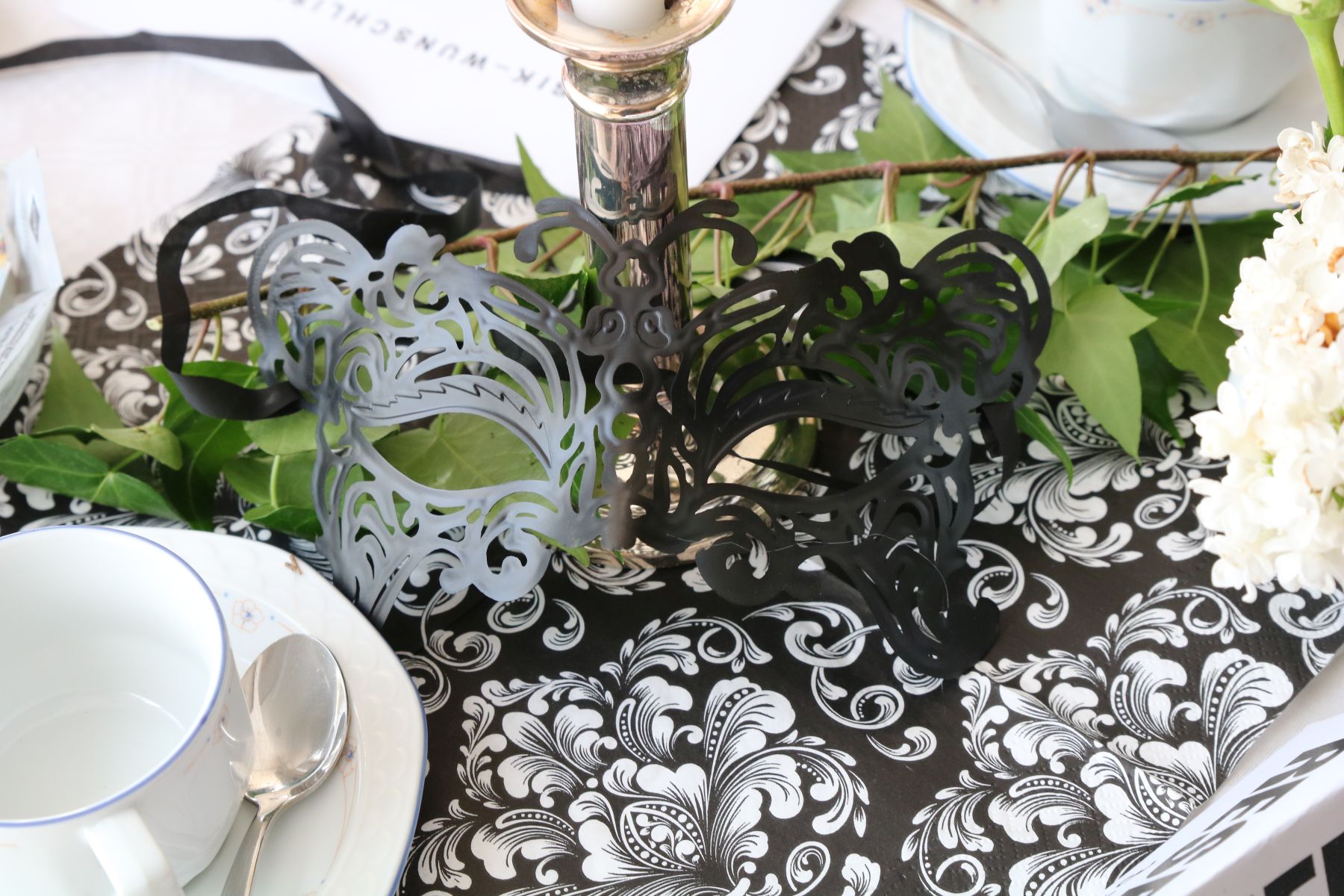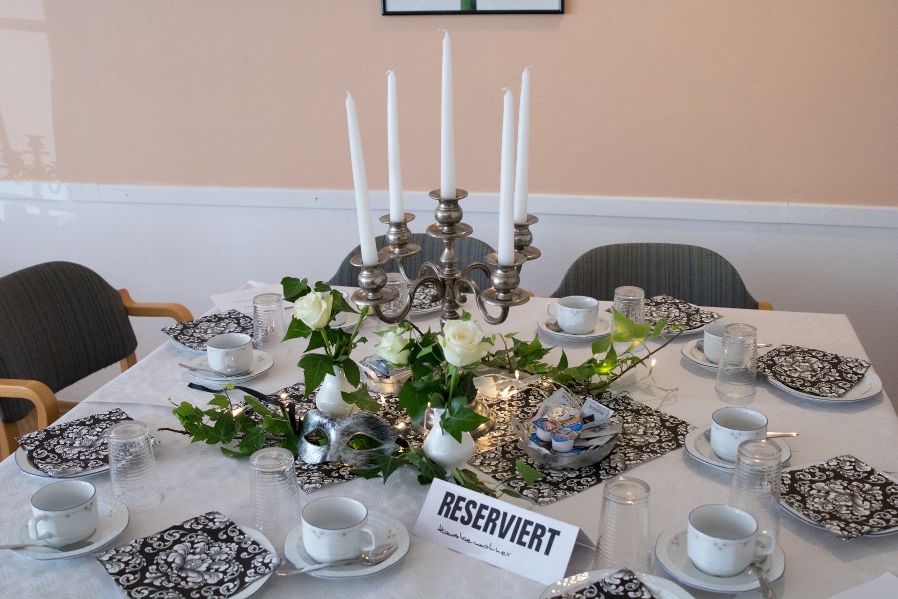 Im April hieß es beim Tanztee Rastatt „Einladung zum Schwarz-Weiß-Ball“. Die Stimmung war ausgelassen und fröhlich, als sich der festlich dekorierte Saal mit elegant gekleideten Gästen in Schwarz-Weiß füllte. Eure Dekofeen Gilla und Elisa hatten sich passend dazu etwas besonderes einfallen lassen: Die funkelnde Dekoration mit edlen Kerzenleuchtern, weißen Blüten und venezianischen Masken versetzte alle in eine zauberhafte Atmosphäre.