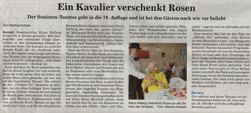 Zu unserem Tanztee im Mai unter dem Motto „Herzlicher Muttertag“ durften wir uns über den Besuch der Presse freuen. Redakteurin Martina Holbein vom BT/BNN nahm sich viel Zeit, um mit ehrenamtlichen Helferinnen und Helfern sowie Gästen zu sprechen und viele Eindrücke beim Tanztee zu sammeln – heraus kam ein sehr stimmungsvoller Artikel. Solche positiven Rückmeldungen auf unsere ehrenamtliche Arbeit bedeuten uns sehr viel!