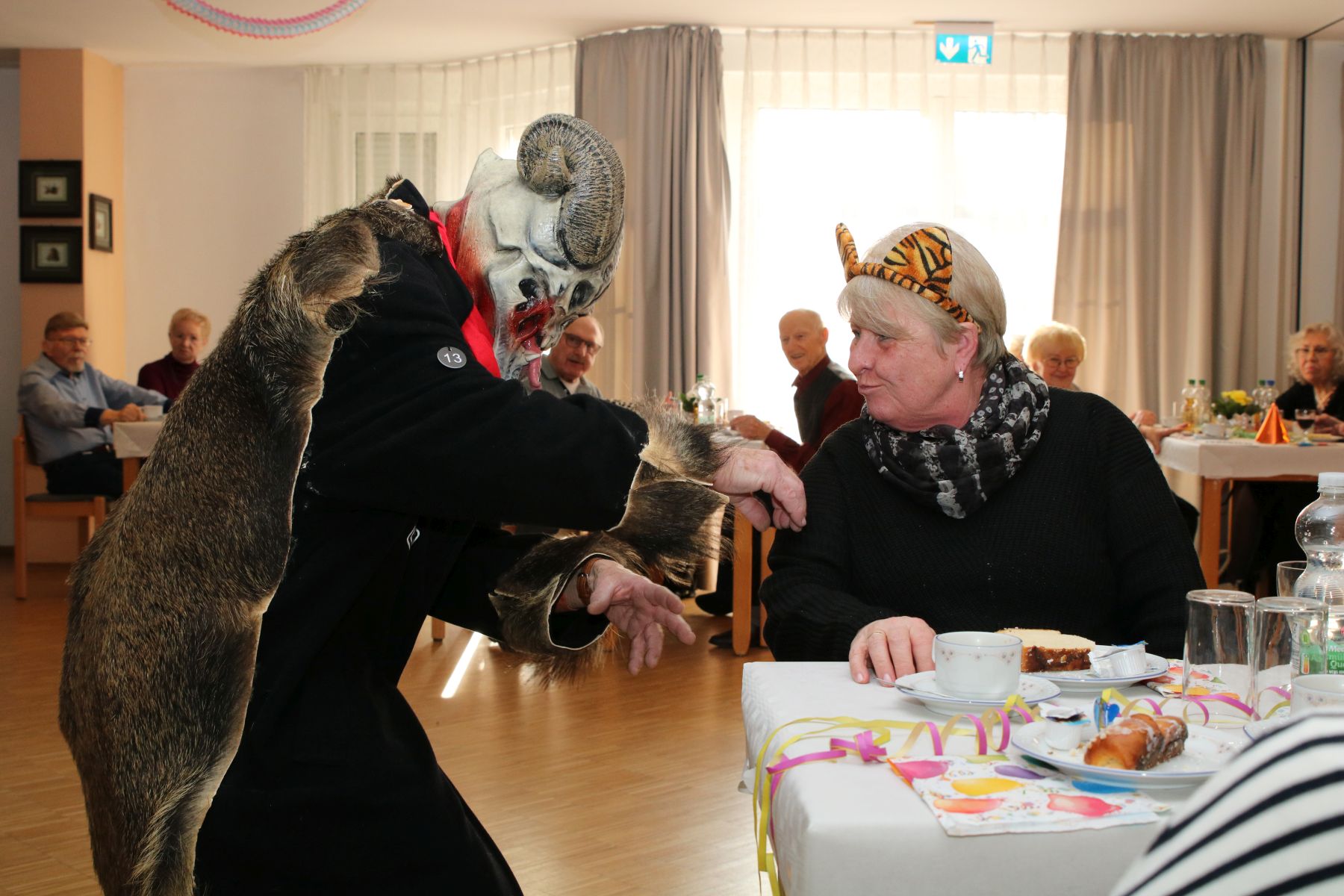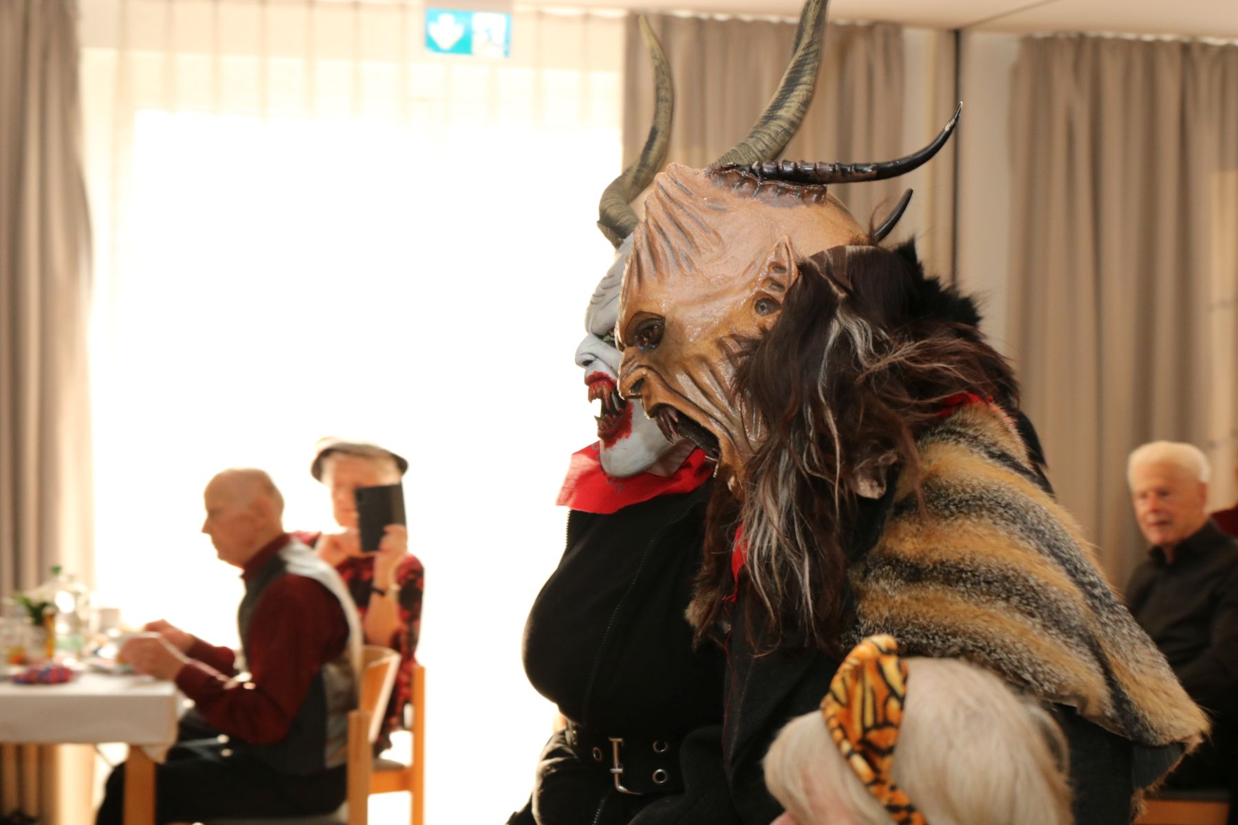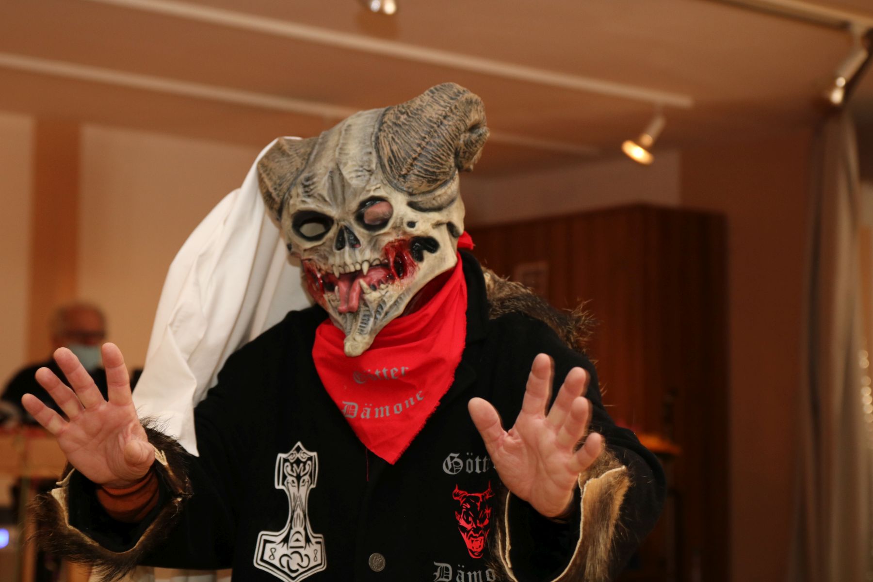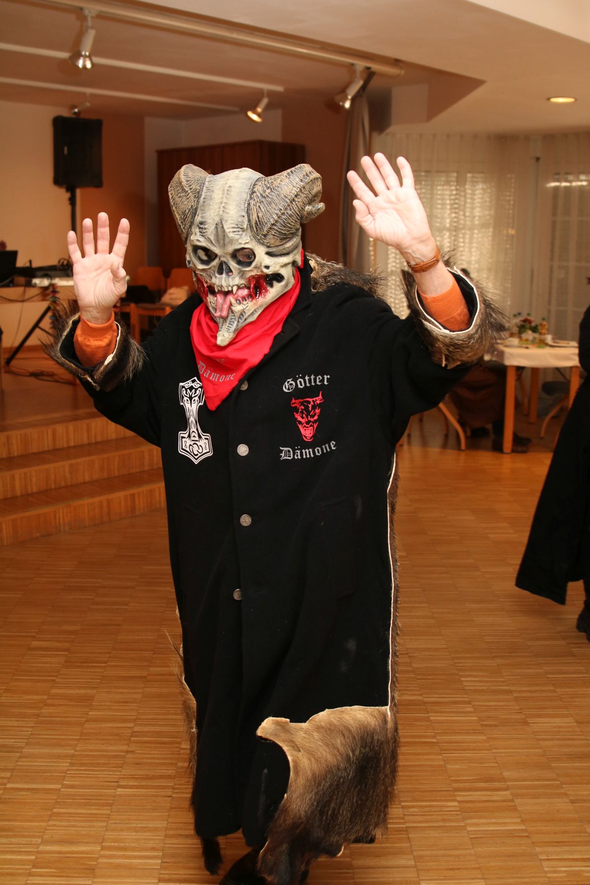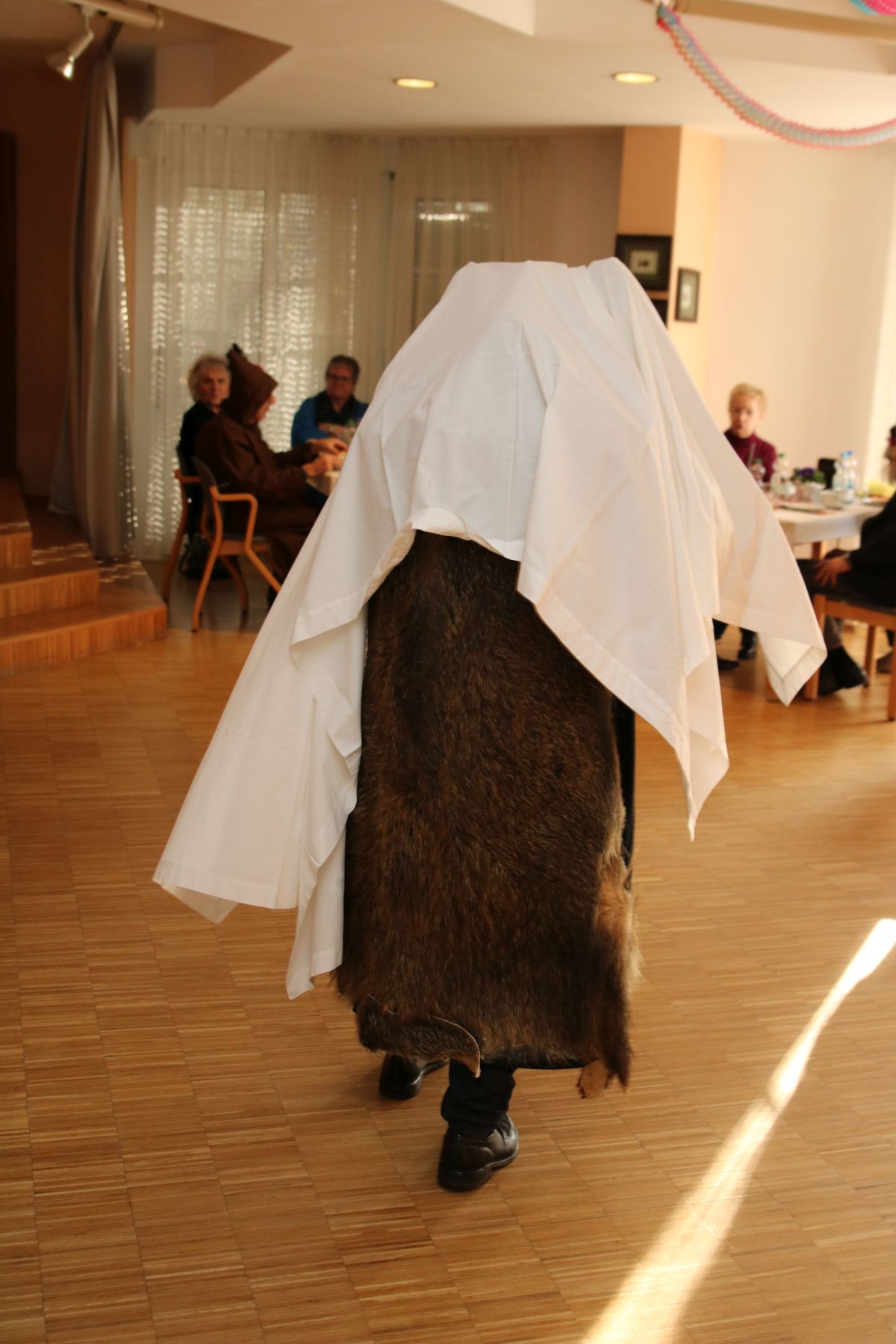 Zu unserer Überraschung erschienen zwei waschechte Gaggenauer Götterdämonen auf dem Parkett. Mit ihren schaurig schönen Holzmasken, Glocken und Tänzen sorgten Markus und Vivien verstärkt durch Klaus, das Phantom des Tanztees, für Umzugs-Stimmung. Was für eine Gaudi!